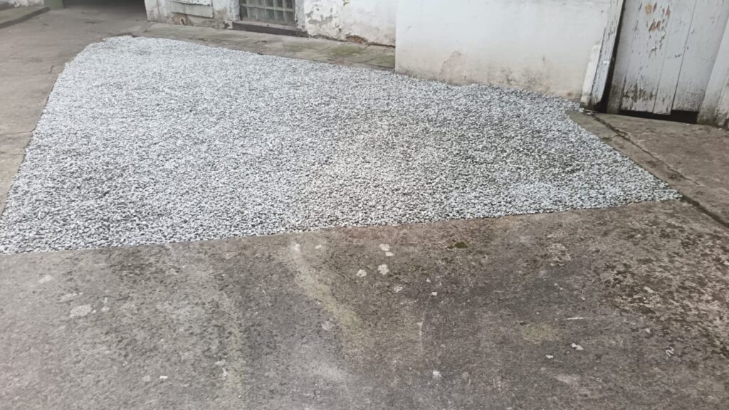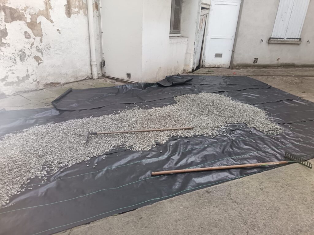 Aménagement réalisé avec géotextile et gravier pour un massif propre, esthétique et facile à entretenir :
