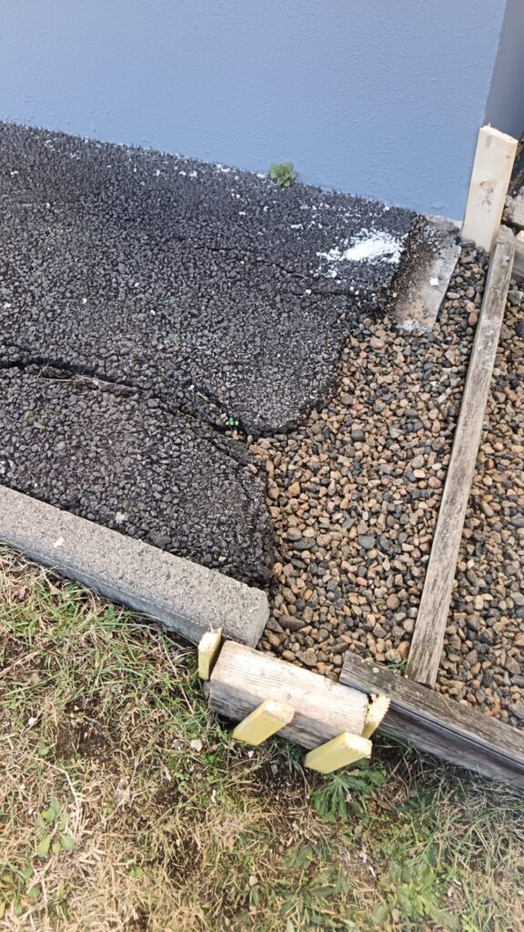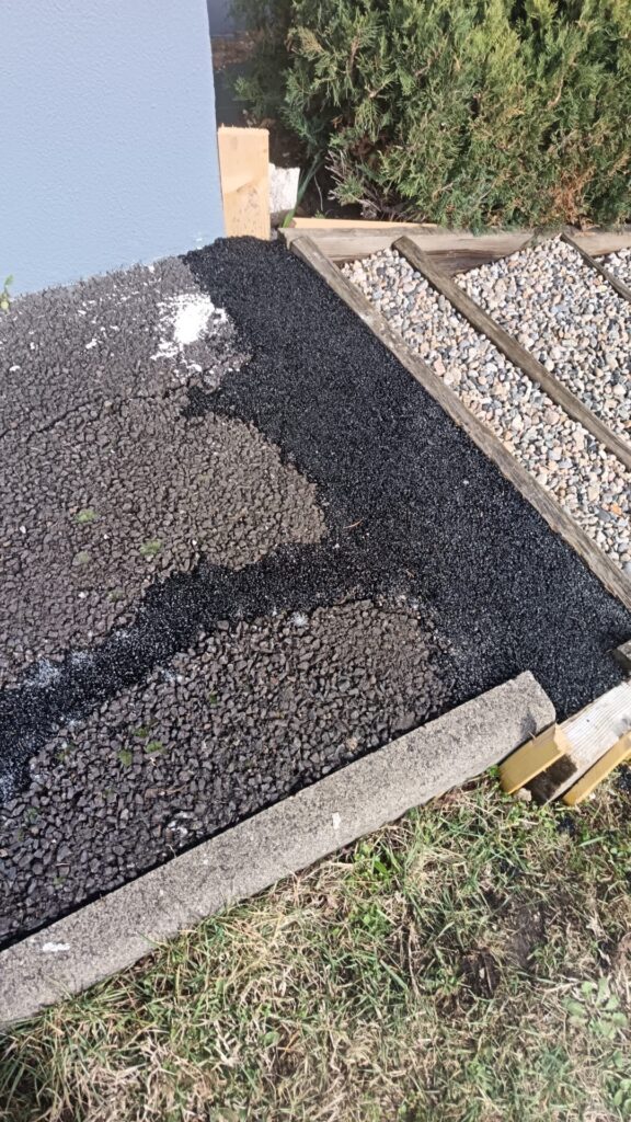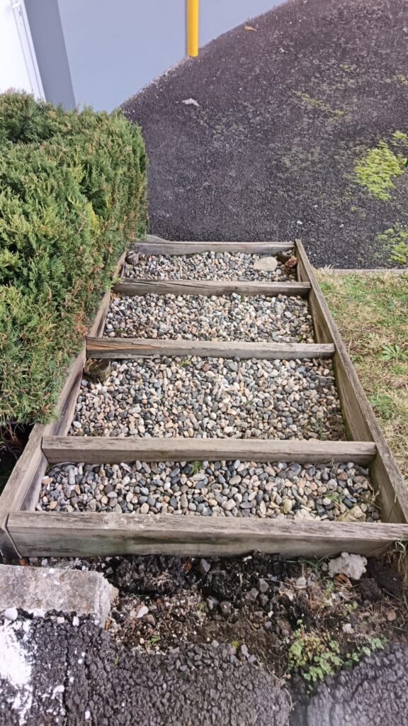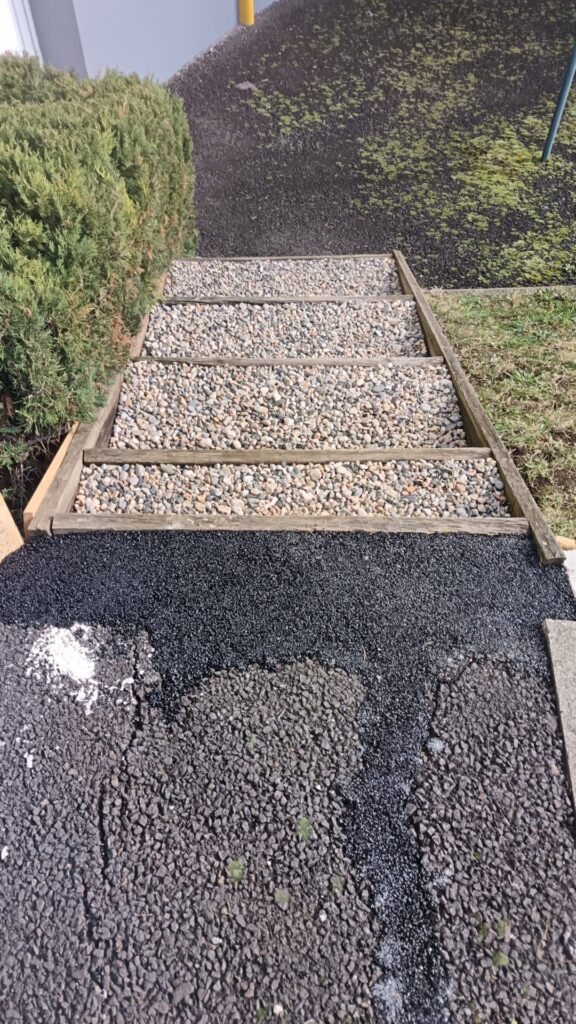 Le gravier en haut de cet escalier a été remplacé par un enrobé en goudron pour un rendu plus propre, plus stable et surtout plus sécurisé